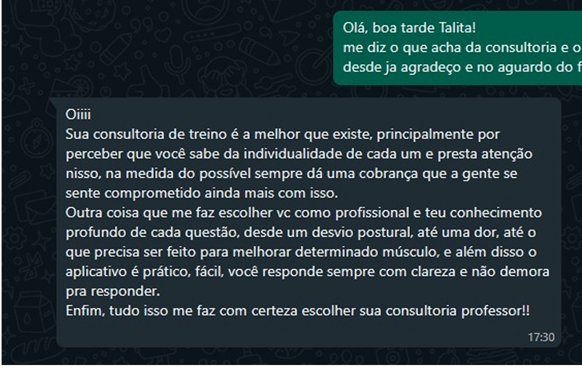 Avaliação Postural + Dieta + Acompanhamento e Correção via vídeos no Whatsapp + Tira Dúvidas via Whatsapp